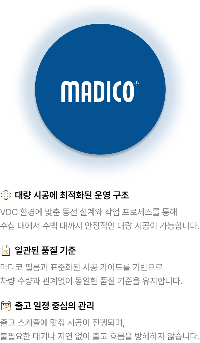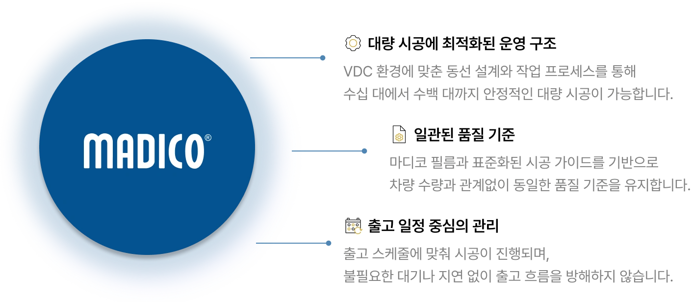 대량 차량 출고 환경에 맞춰 시공 품질과 일정 편차를 최소화하도록 설계되었습니다.
